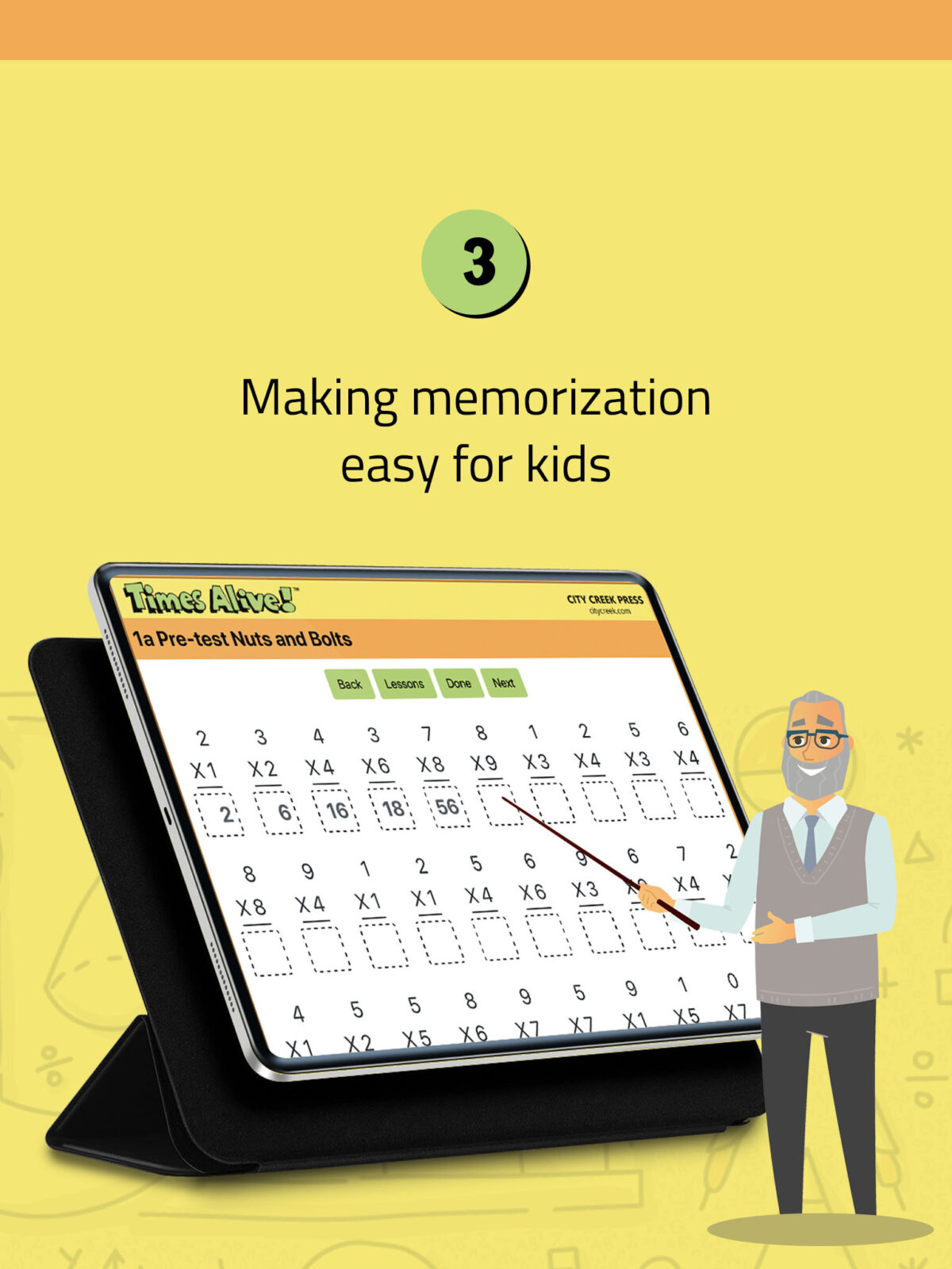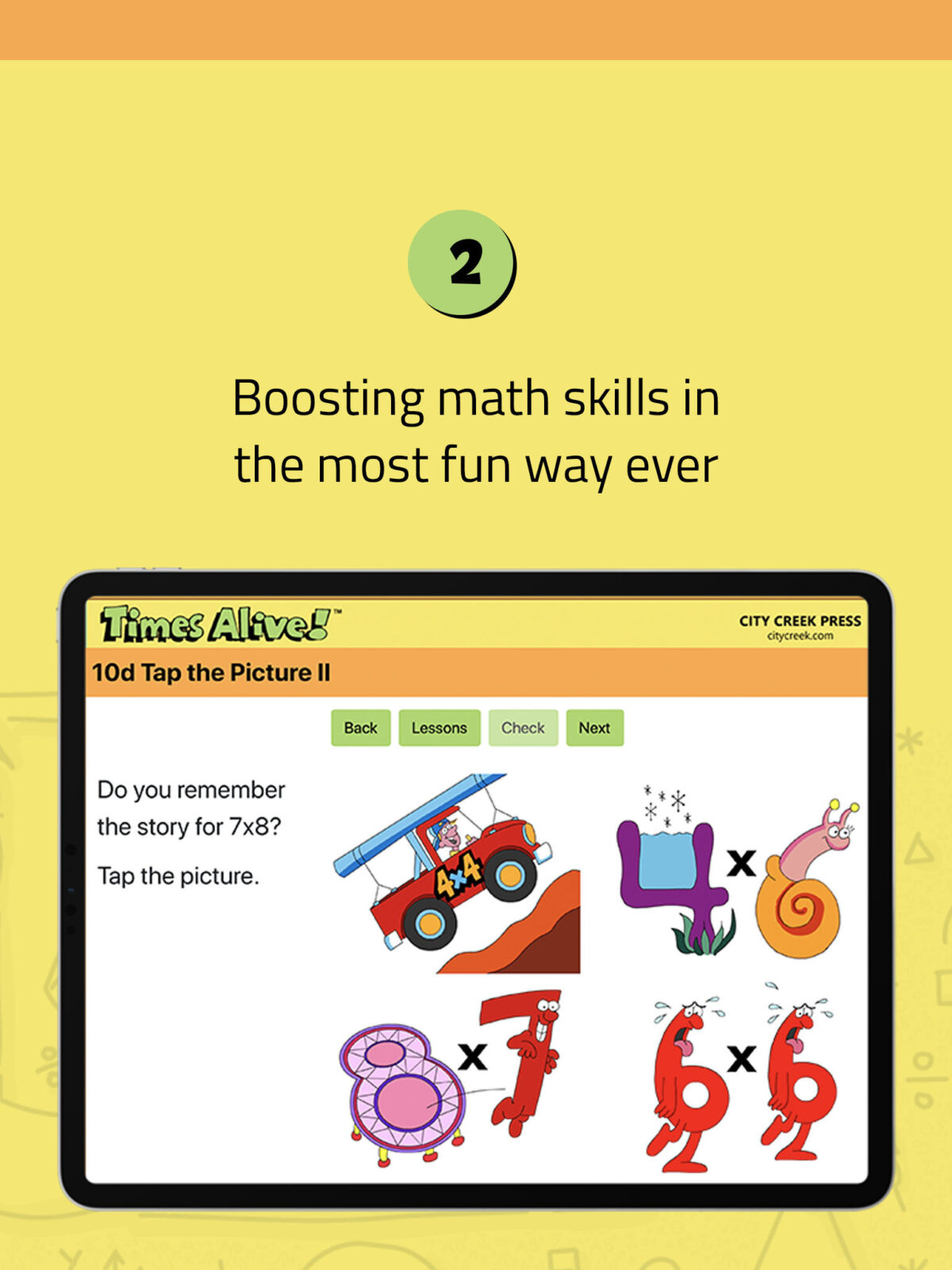 Learn the 0s-9s Times Tables with Stories and Songs. Free Times Alive Lite version at the Apple Ap store includes free scorable times tables quiz plus Lessons 1-3 with in-app purchase option to teach all the times tables 0s-9s. Studies show our picture, story, and song program out performs most methods for effectiveness and retention of the multiplication facts. Times Alive includes animated cartoons, stories, songs, quizzes, and interactive games. It keeps track of student progress showing completed lessons, test scores, and time for completion. Available for android at Google Play store.