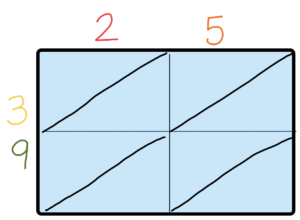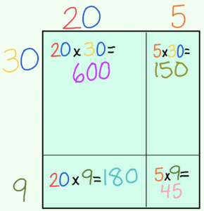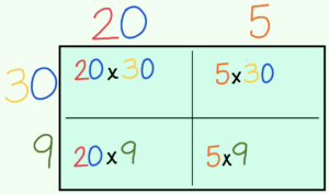 1. Draw a box, and divide it up both ways, but this time draw the “area” of the box representing the 20 much bigger than the area representing the 5. The area of the box showing 30 is bigger than the area showing 9.