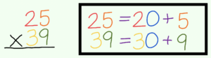 We will practice the strategies using two 2-digit numbers, 25 and 39. Remember how to divide them into tens and ones? Here are the methods and the steps.