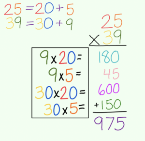 The main thrust of the new methods, as you will see below, is to give children a better understanding of what is happening when you multiply numbers. Rather than just following an algorithm, most of the new methods are based around some form of taking numbers apart, doing “easy” math, then adding the answers back together. (More on that later. Don’t panic.)
